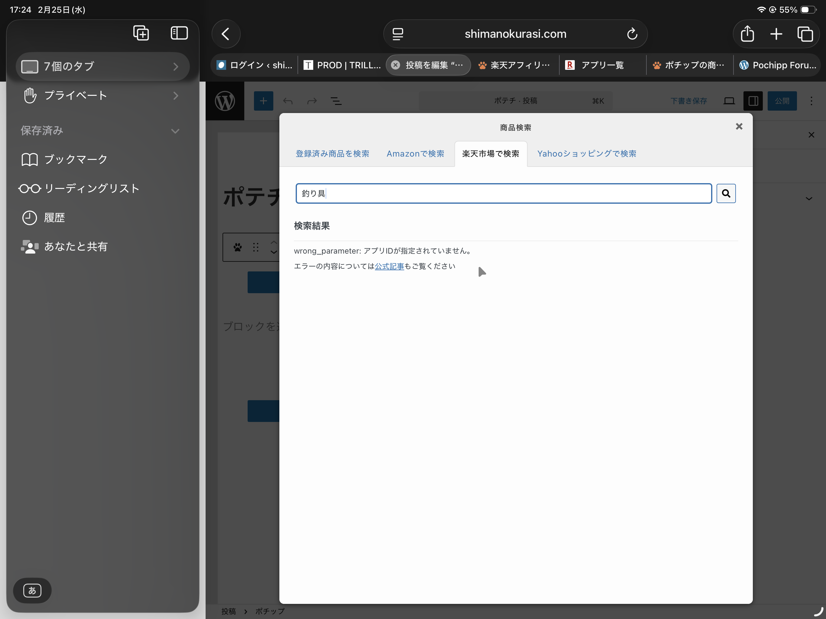 ポチップ設定で説明の通りに入力しましたが、商品検索でエラーとなってしまいます。